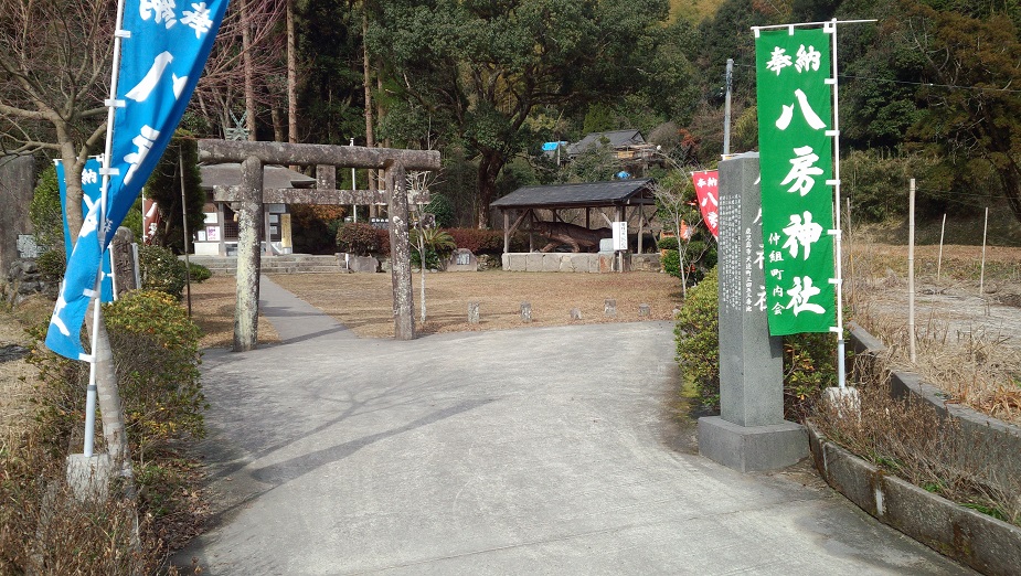 向かい側には、大きな木彫りと思われる大虎が置いてある「八房神社」があります。