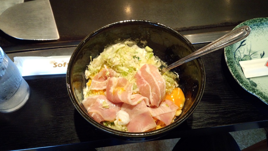 ここは自分で作るみたいだ。具を混ぜたり 鉄板に敷いたりは問題はないけど