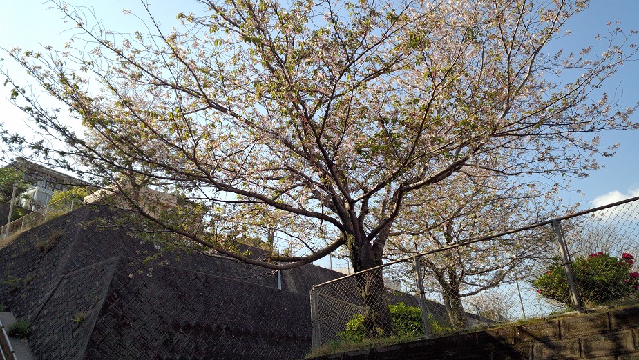 近所の今日の桜の状況は もう葉っぱが50%くらいだろうか、