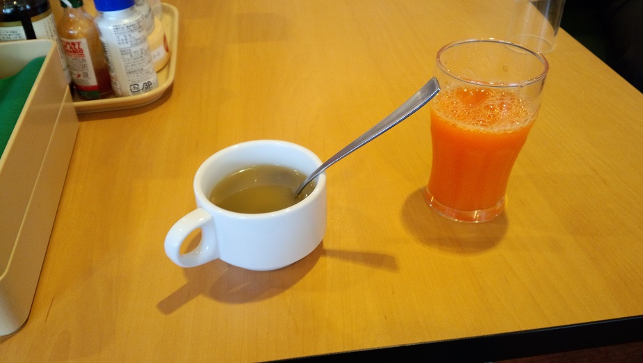 メインが来る前に ドリンクの野菜ジュースとスープです。お替わりは自由です。