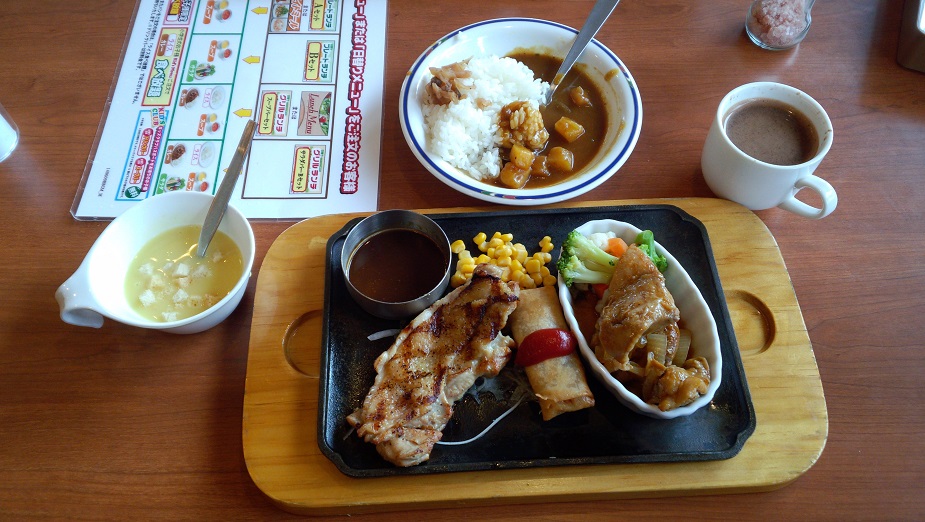 まずはカレー、スープ、ドリンクです そしてメインのチキンが来ました。この時点でカレー・スープは2杯目3杯目のカレーとスープ