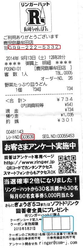 今回も支払レシートにアンケート用紙が付いていた。