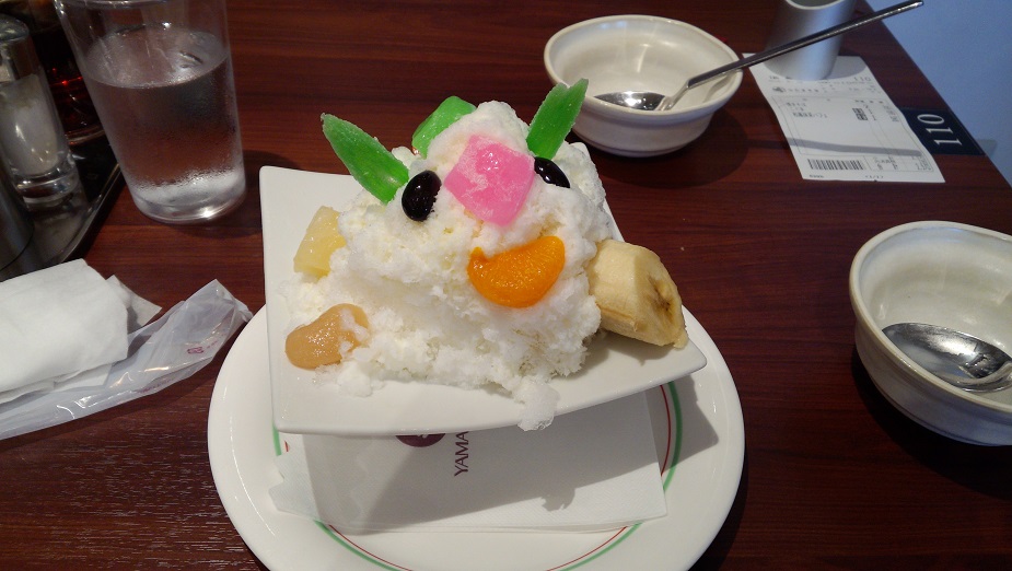 いつもの「焼きそば」と夏には欠かせないカキ氷「白熊」のちいさいやつ、「こぐま」を注文。