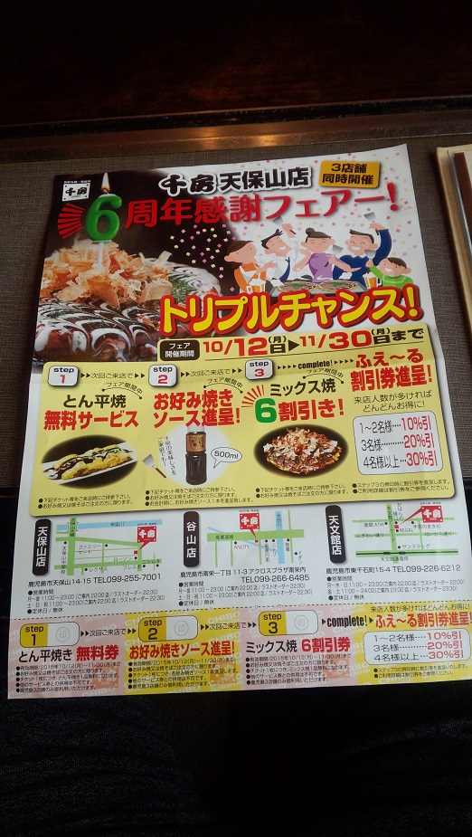 このチラシにはお好み焼きか焼きそばを注文の方には「とん平焼き」が無料となっていた。