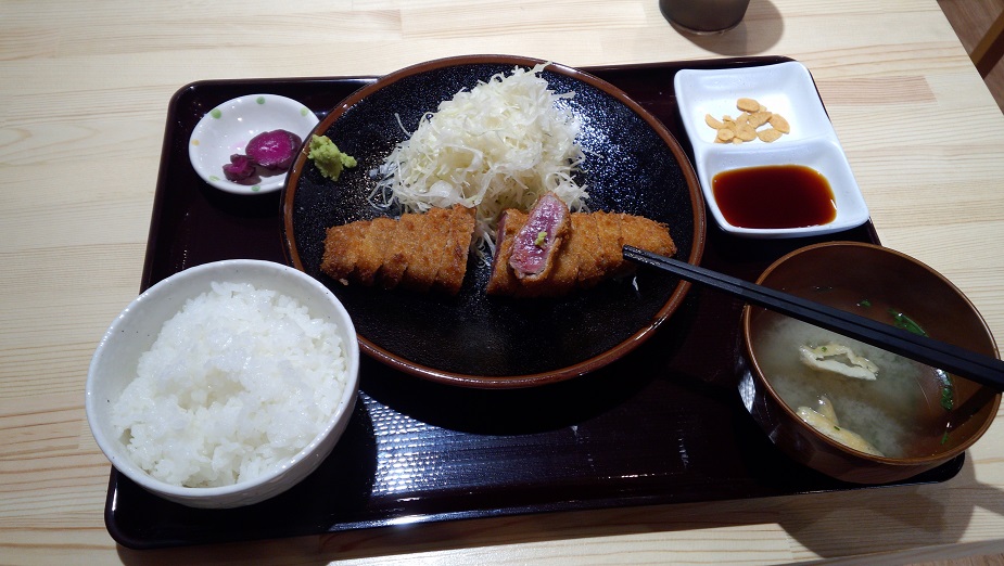 ランチもあったけど 今日は「牛かつ定食」にした。牛かつ120g・ごはん(大盛り無料)・お漬物