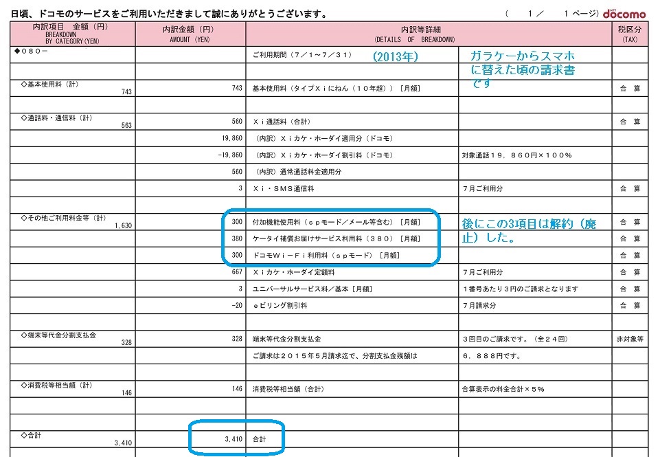 先ずガラケーからスマホに替えた頃の2013年7月分の請求書です。