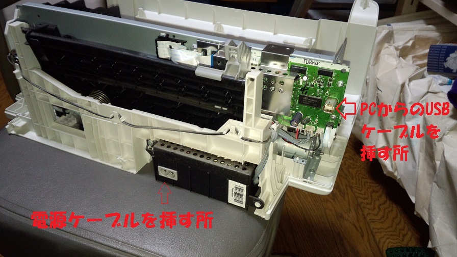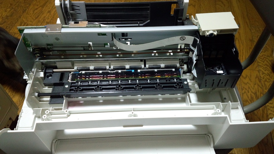 上部を取り外し前部からみたところ。右側の黒いBOXはカートリッジ式インクを入れるところ。